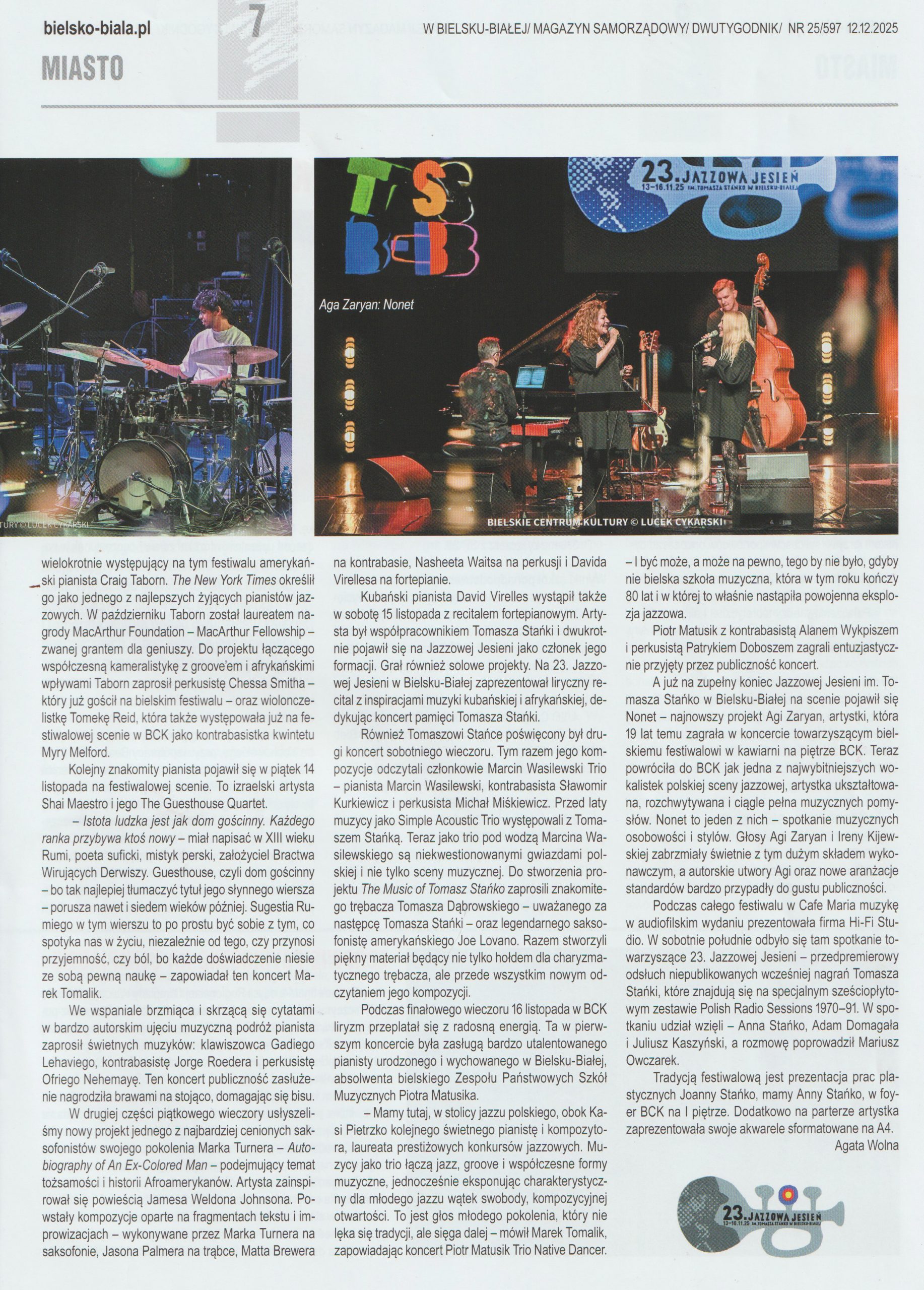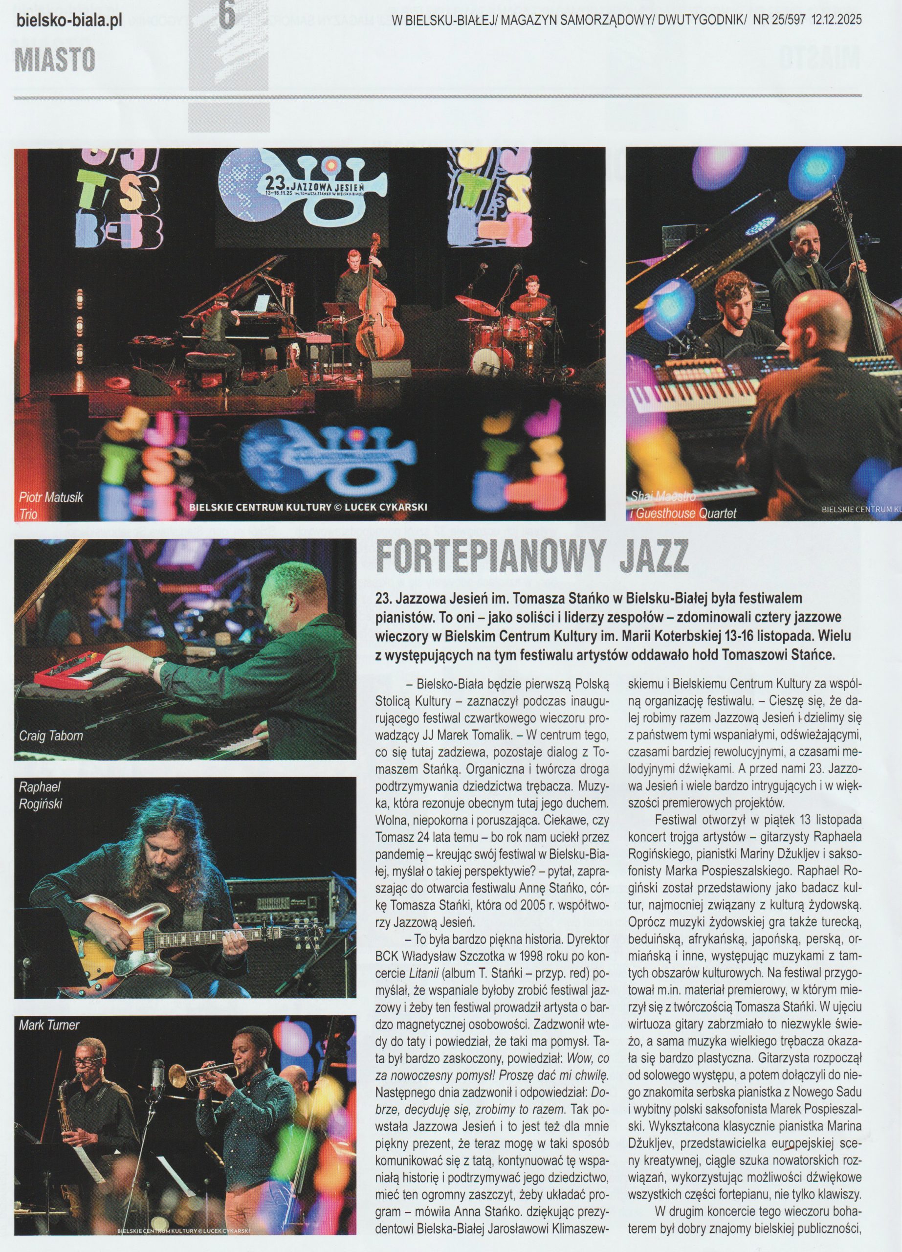 16.11.2025 zakończyła się 23 edycja Jazzowej Jesieni im. Tomasza Stańko w Bielsku-Białej. 13 raz miałem przyjemność i zaszczyt prowadzić ją jako MC. 4 dni, 8 wspaniałych koncertów trzymających najwyższy światowy poziom. Czyli jak zwykle tonęliśmy w przepięknych choć często niepokornych dźwiękach. Jazzowa Jesień to miejsce spotkań wizjonerów jazzu – mistrzów i młodych gniewnych sztuki improwizacji – przestrzeń namysłu nad tym czym jest muzyka i jej tożsamość: indywidualna, polska, europejska i ludzka.